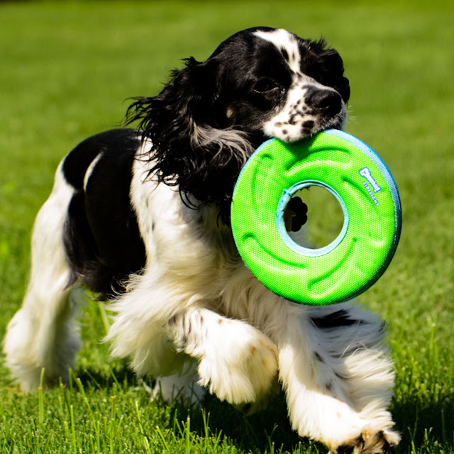 The past few weeks I have photographed Lucy fetching a ball and her "camo-duck". Most recently she is working on fetching a soft frisbee. She doesn't have a clue that she could catch it in flight, she just chases it until the frisbee hits the ground, then fetches it back to me. The toy has a hole in the center like a doughnut...